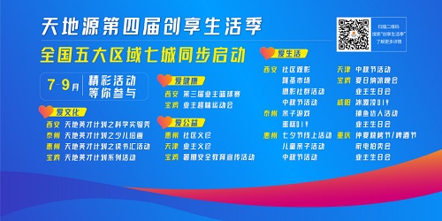 本届创享生活季,天地源五大区域公司将以“爱文化、爱生活、爱健康、爱公益”为主题,在销售案场、物业小区内组织开展天地英才计划、社区邻里节、夏日纳凉晚会等三十余场形式多样的社群活动。本届生活季的又一亮点:“乘风破浪的宝宝”——天地源“萌宝”全国选拔赛宣告启动,天地源将邀请全国区域的小业主们尽情展示才艺,悦动暑期。
